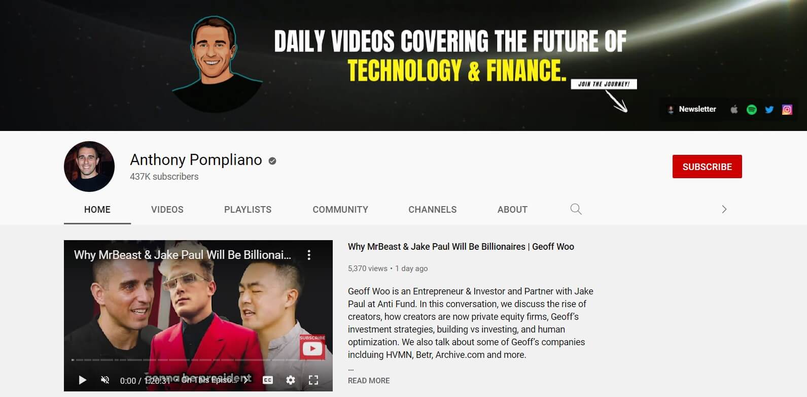Anthony Pompliano, founder of Morgan Creek Digital, hosts The Pomp Podcast, covering business, crypto, and investing. His YouTube presence emphasizes infrastructure, long-term investing, and macro trends.