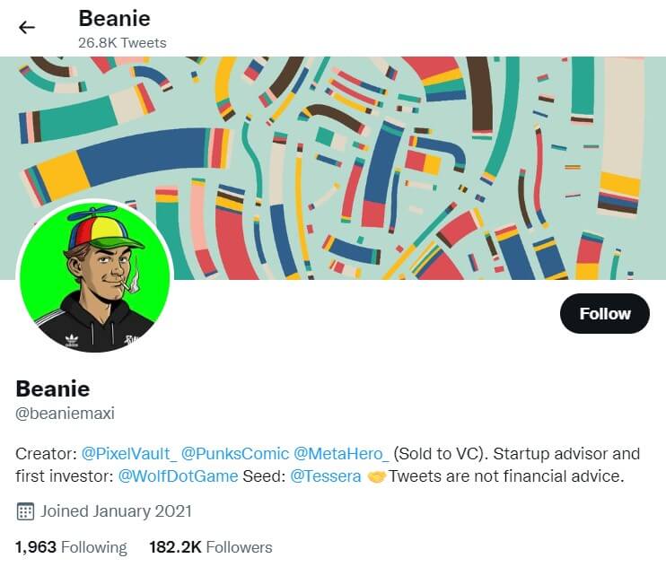 Beanie is an entrepreneur and NFT influencer behind projects such as Pixel Vault, Punks Comic, and Meta Hero. He is known for combining NFT collecting with startup-style ecosystem building.
