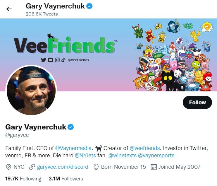 Gary Vaynerchuk is the CEO of VaynerMedia and one of the most recognizable figures in digital marketing and NFTs. He gained major attention in the NFT space in 2017 by publicly promoting CryptoPunks and helping introduce them to mainstream celebrities such as Mr. Beast and Logan Paul.