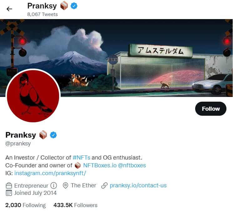 Pranksy is a pseudonymous NFT investor known for owning one of the largest and most valuable NFT collections on Ethereum. His portfolio includes major projects such as CryptoKitties, NBA Top Shot, Art Blocks, Stoner Cats, and more.
