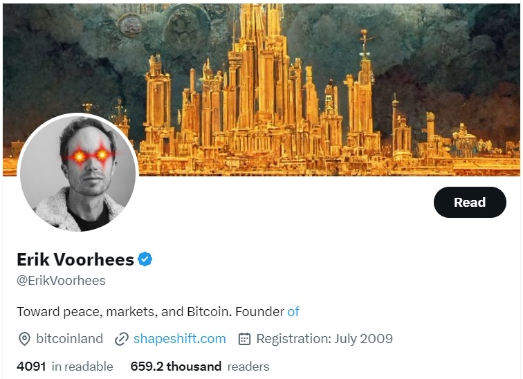 Founder of ShapeShift and co-founder of Coinapult, Erik Voorhees is one of the strongest philosophical voices in crypto. He writes about freedom, money, and decentralization.
